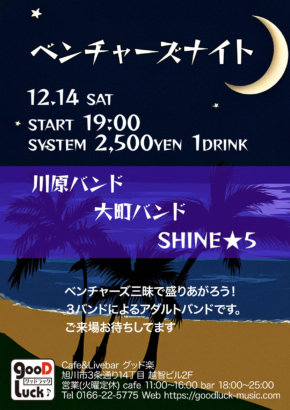 年末 親爺バンドまだまだ頑張りますライブ♪今夜はベンチャーズ三昧ダァ〜テケテケ気分で来年も弾きまくる気まんまん!みなさん応援よろしくお願いします(^-^) イベント案内 開催日 2025年12月14日 日曜日 オープン 18:30 スタート 19:00 システム 2,500円 1ドリンク付き 詳細 出演者 川原バンド 大町バンド SHINE ☆ 5 お問合せ/予約 グッド楽 | TEL : 0166-22-5775 X(旧Tweet) Facebook LINE はてな