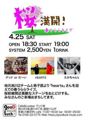 桜前線の到来!爽やかな季節に3チームによる春うららライブ。お見逃しなく。みなさまのご来場お待ちしてます。 イベント案内 開催日 2026年4月25日 土曜日 オープン 18:30 スタート 19:00 システム 2,500円 1ドリンク付き 詳細 出演者 デッド or だ〜い たかちゃん’shearts お問合せ/予約 グッド楽 | TEL : 0166-22-5775 X(旧Tweet) Facebook LINE はてな