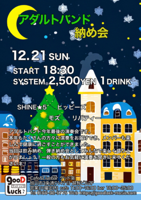 アダルトバンド年末演奏会!4組の親父バンドがクリスマス前に盛り上げます。一般のお客様大歓迎です。 イベント案内 開催日 2025年12月21日 日曜日 オープン 18:00 スタート 18:30 システム 2,500円 1ドリンク付き 詳細 出演者 SHINE ☆ 5ヒッピーズモズリバティー お問合せ/予約 グッド楽 | TEL : 0166-22-5775 X(旧Tweet) Facebook LINE はてな