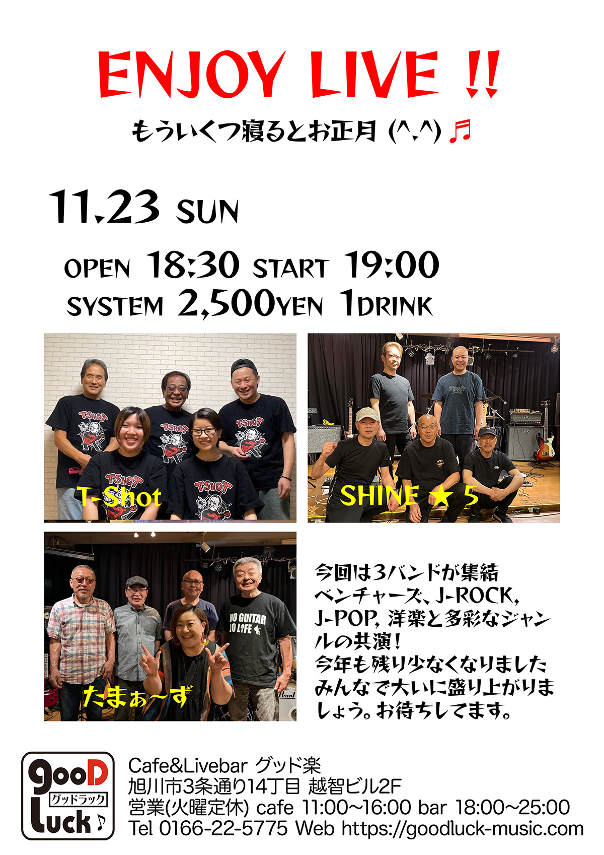 ENJOY LIVE !-もういくつ寝るとお正月-3バンドのコラボライブ!ベンチャーズ,J-rock,j-pop,洋楽,の多彩なジャンルの共演。今年も残り少なくなりました。みんなで大いに盛り上がりましょう。お待ちしてます^ – ^ イベント案内 開催日 2025年11月23日 日曜日 オープン 18:30 スタート 19:00 システム 2,500円 1ドリンク付き 詳細 出演者 SHINE ★ 5 たまぁ〜ず T-Shot (順不同) お問合せ/予約 グッド楽 | TEL : 0166-22-5775 X(旧Tweet) Facebook Pocket LINE はてな