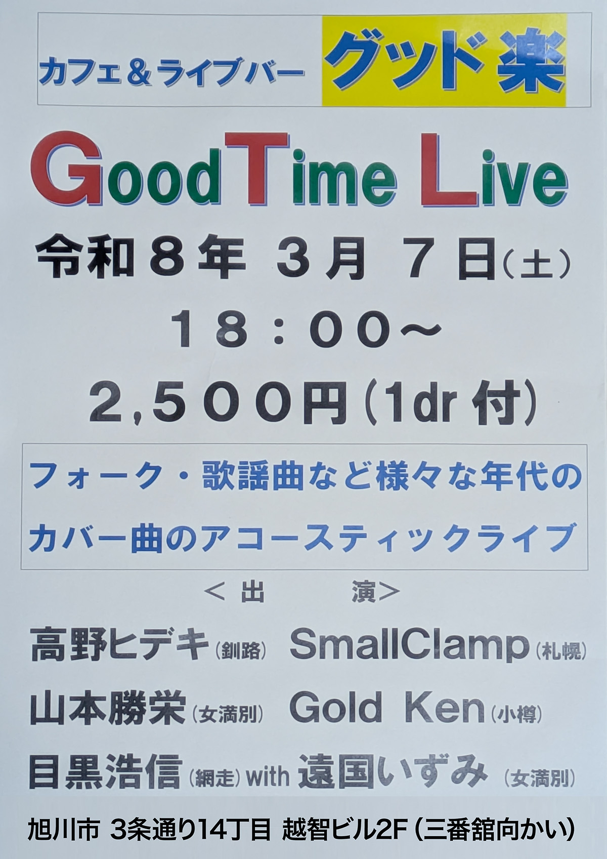 全道各地よりアコースティックな仲間が集結。フォーク・歌謡曲・など様々な年代のカバー曲を中心にGooD 楽で大集結する。楽しいひと時をお過ごしください。 イベント案内 開催日 2026年3月7日 土曜日 スタート 18:00 システム 2,500円 1ドリンク付き 詳細 出演者 高野 ヒデキ (釧路) 山本 勝栄 (女満別) 目黒 浩信 (網走) Small Clamp (札幌) Gold Ken (小樽) 遠国 いずみ (女満別) お問合せ/予約 グッド楽 | TEL : 0166-22-5775 X(旧Tweet) Facebook LINE はてな