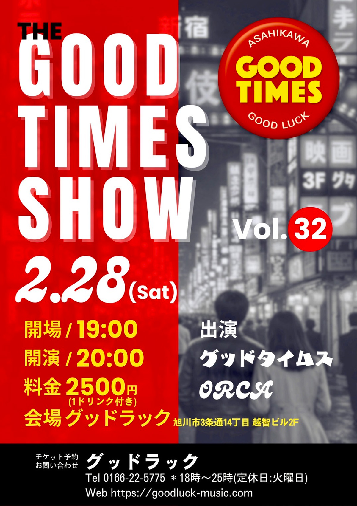 マンスリーLIVE「THE GOOD TIMES SHOW vol.32」今月はロックバンド「ORCA」さんをゲストに迎え聴きごたえある2バンドの共演です。 ただいま予約受付中! イベント案内 開催日 2026年2月28日 土曜日 オープン 19:00 スタート 20:00 システム 2,500円 1ドリンク付き 詳細 出演者 GOOD TIMES ORCK(ゲスト) お問合せ/予約 グッド楽 | TEL : 0166-22-5775 X(旧Tweet) Facebook LINE はてな