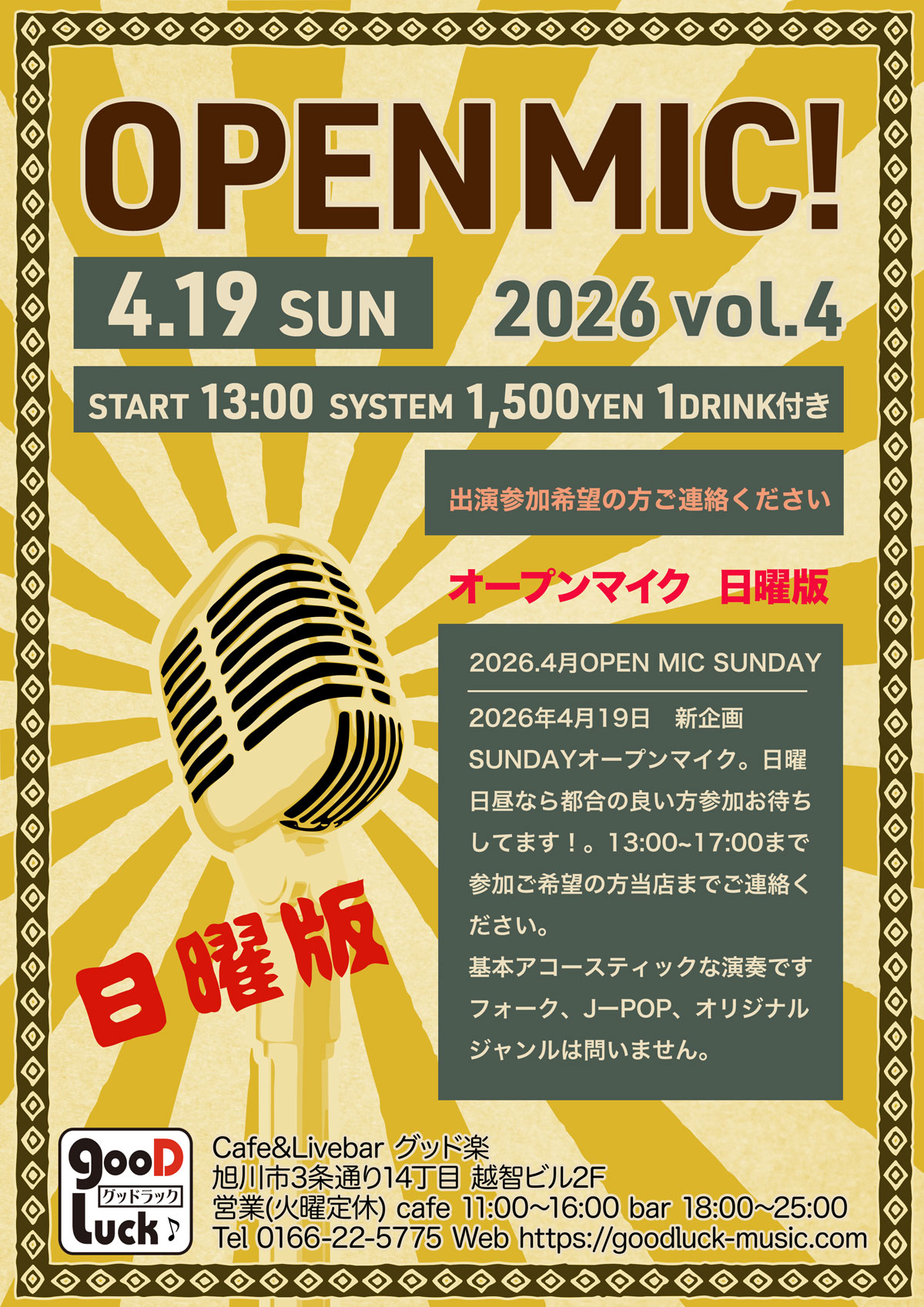 SUNDAY オープンマイク!日曜日なら都合の良い方で参加希望の方お待ちしてます。スタート13:00~17:00までお友達にもお声がけしてください。只今予約受付中です(0166-22-5775)DOOD楽まで イベント案内 開催日 2026年4月19日 日曜日 スタート 13:00 システム 1,500円 1ドリンク付き 詳細 出演者 参加された皆さん お問合せ/予約 グッド楽 | TEL : 0166-22-5775 X(旧Tweet) Facebook LINE はてな