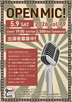 2026.5月オープンマイク参加希望の方、予約(0166-22-5775)GooD楽までご連絡ください。初めての方、馴染みの方お待ちしてます。 イベント案内 開催日 2026年5月9日 土曜日 スタート 19:00 システム 2,500円 1ドリンク付き 詳細 出演者 ご予約されたお客様 お問合せ/予約 グッド楽 | TEL : 0166-22-5775 X(旧Tweet) Facebook LINE はてな