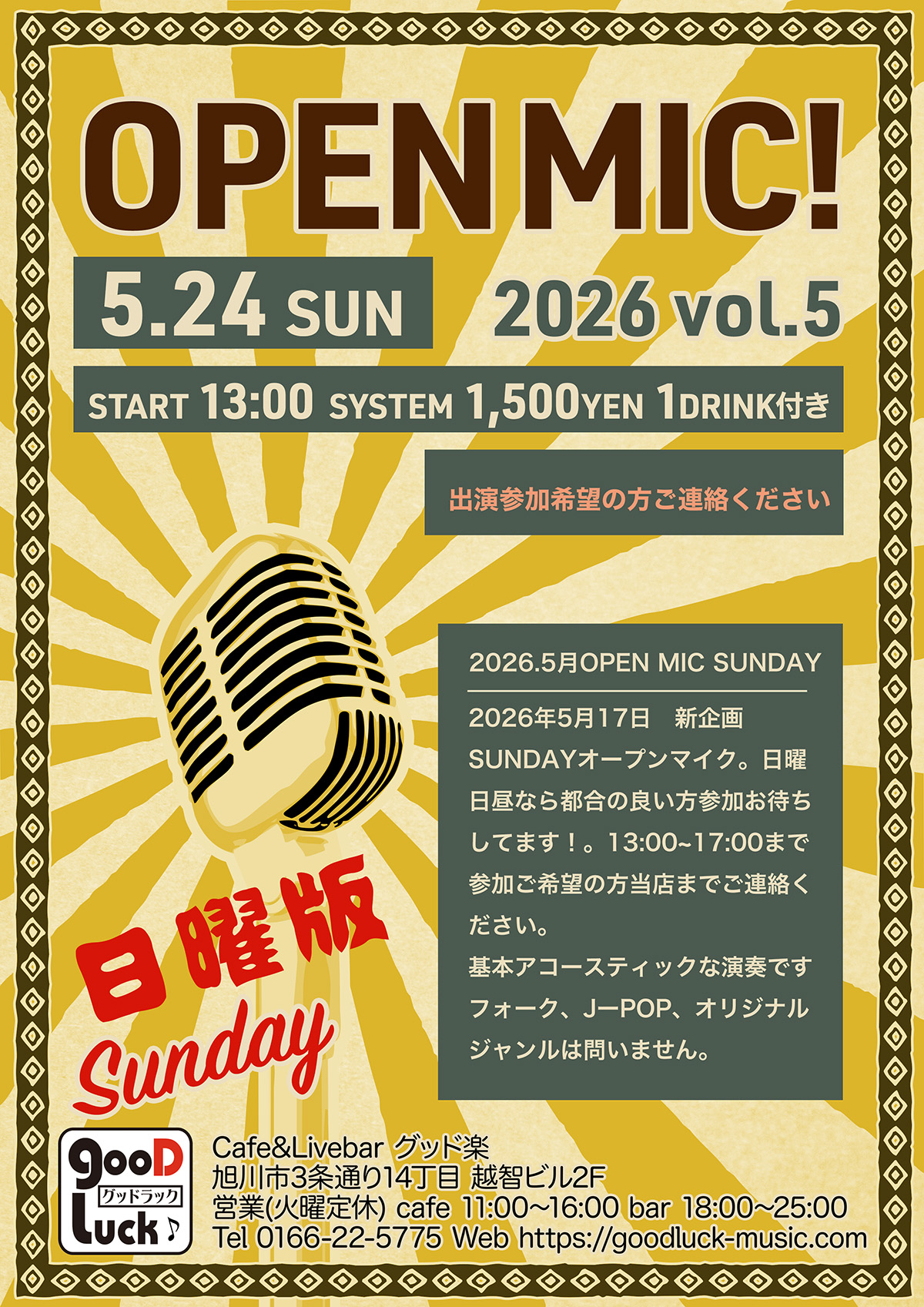 新たにスタートしたオープンマイク 日曜版!!参加者受付中です。GOOD楽(0166-22-5775)までご連絡ください。 イベント案内 開催日 2026年5月24日 日曜日 スタート 13:00 システム 1,500円 1ドリンク付き 詳細 出演者 参加されるお客様 お問合せ/予約 グッド楽 | TEL : 0166-22-5775 X(旧Tweet) Facebook LINE はてな