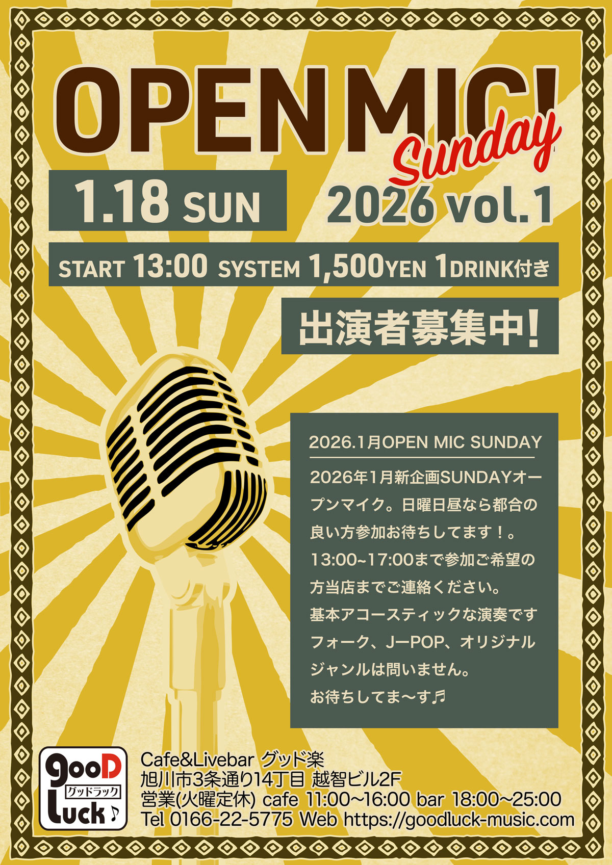2026年度より新企画。月一度の[Sandy OPEN MIC]を開催いたします。日曜の昼の時間帯(PM13:00~17:00)なら参加できると言う方参加お待ちしてます。要予約です。 イベント案内 開催日 2026年1月18日 日曜日 スタート 13:00 終了時間 17:00イベントの内容によって終了時間が前後する場合がございます システム 1,500円 1ドリンク付き 詳細 出演者 エントリーされたお客様 お問合せ/予約 グッド楽 | TEL : 0166-22-5775 X(旧Tweet) Facebook LINE はてな